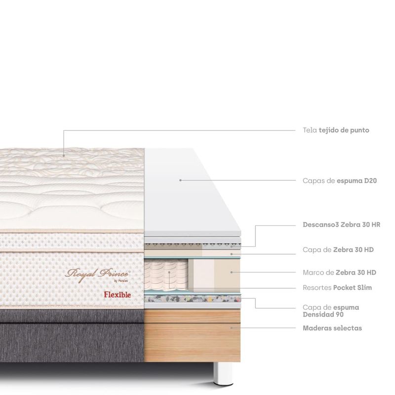 Conoce el Royal Prince Flexible y experimenta un descanso único. El lujo de su cubierta de tela higroscópica e hilos de viscosa, le dan a tu descanso una mayor suavidad y frescura. Con un panel de resortes Pocket Slim y capas de espuma Zebra D30, te brindan una mayor adaptabilidad a cada curva de tu cuerpo, proporcionando el soporte óptimo que mereces.