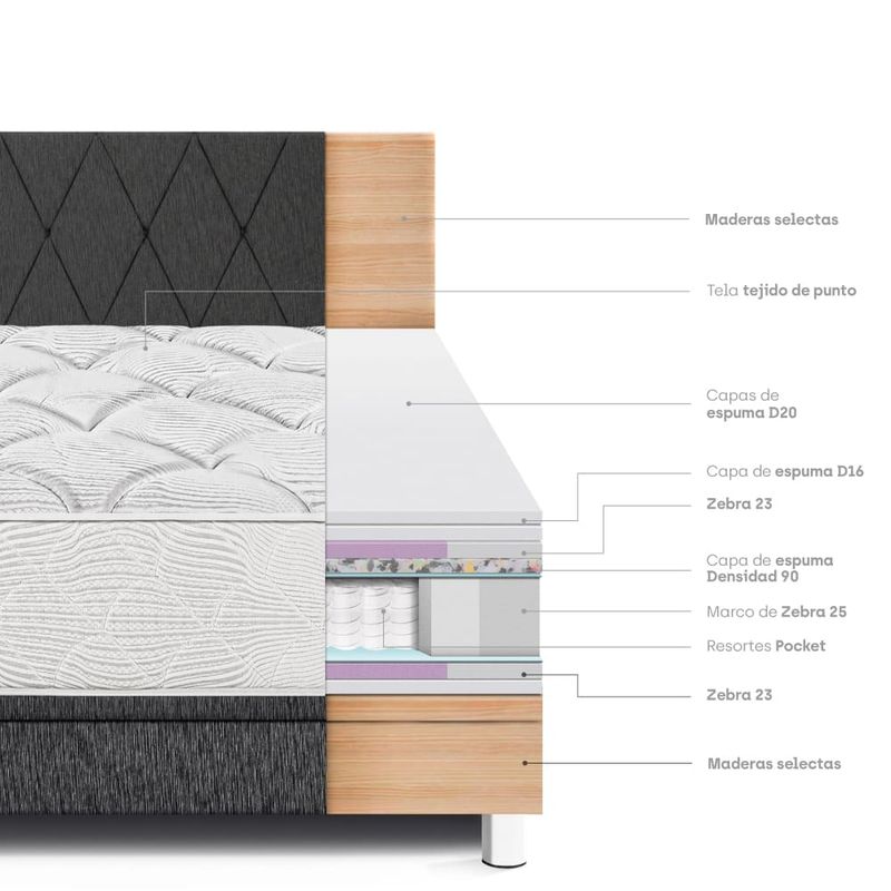 Creado con tela tejido de punto que le brindará frescura a tu descanso y un acolchado suave para una mayor comodidad. Además sus resortes pocket son encapsulados para que nada interrumpa tu sueño. Por dentro está conformado por capas de espuma Zebra 23 que fortalecerán el colchón y un marco de espuma Zebra 25 recubriendo el todo el contorno de los resortes Pocket para darle estabilidad.